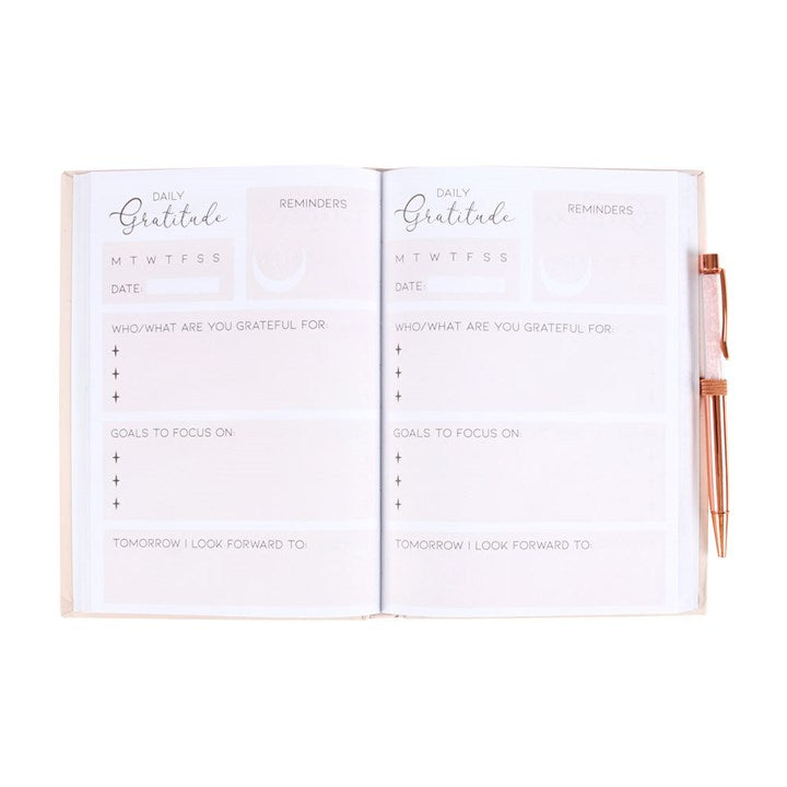 This sleek gratitude journal features printed prompts perfect for tracking daily affirmations, goals and lists of things to be thankful for. Includes a matching rose quartz chip ballpoint pen and makes a meaningful and practical gift for those with big dreams.