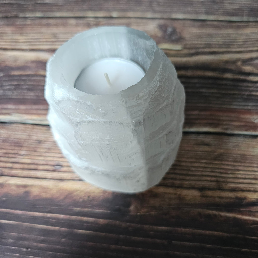 Selenite Candle Holders are shiny and sometimes with whiter areas. Top of each candle holder is polished and the underside is cut flat.