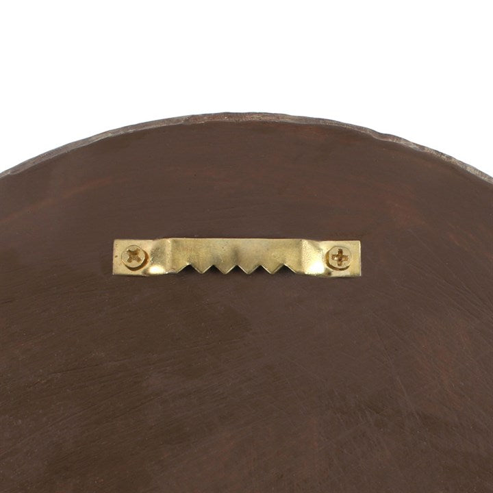 Inspired by the Green Man Pagan god, also referenced as the "Man of the Woods", this round face plaque features acorn details and green and red coloured foliage.